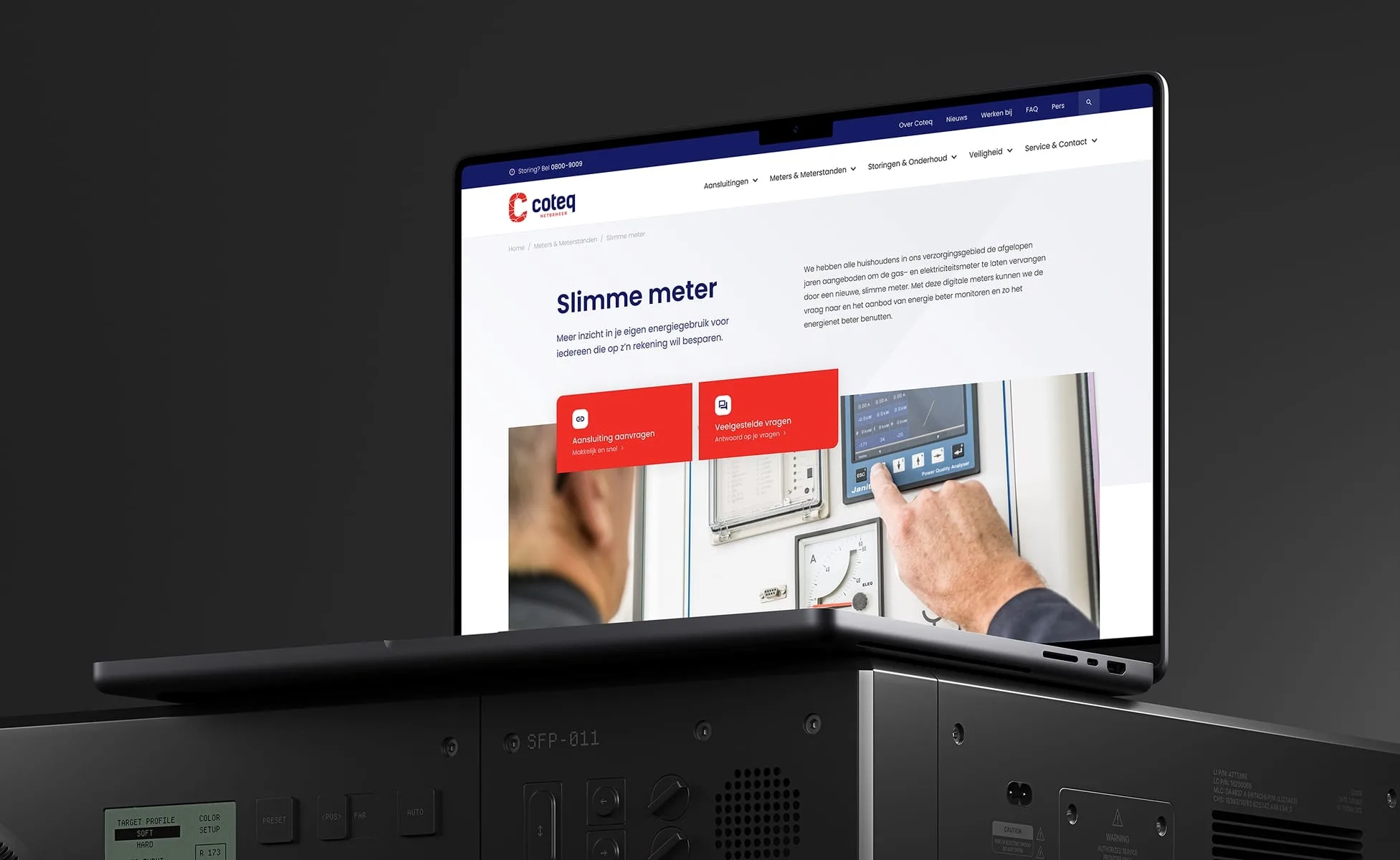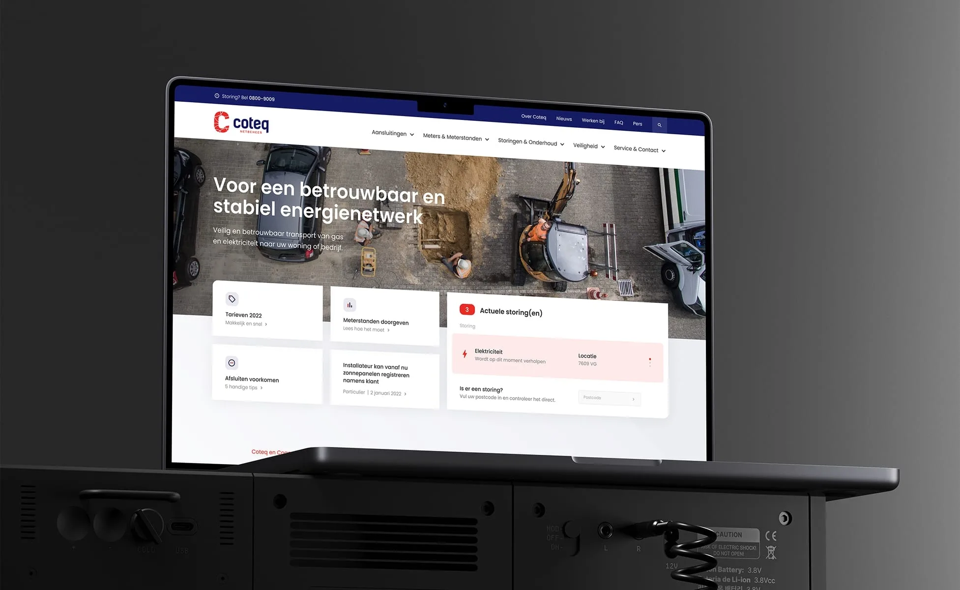 De informatie op de website is veelzijdig. Vanuit verschillende behoeften kan er een bezoek worden gebracht aan de website van Coteq Netbeheer. Mede daarom is ervoor gekozen om boven de fold op de homepagina de mogelijkheid te bieden om direct naar specifieke detailpagina’s te navigeren of actuele (nieuws)items uit te lichten die relevant zijn voor de bezoeker. Ook worden hier duidelijk en overzichtelijk de storingen getoond.
